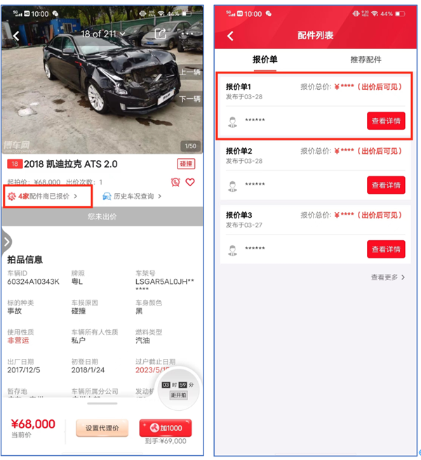 1、车辆在竞拍过程中,出过价的会员可在车辆详情页“XX家配件商已报价-配件列表-报价单”,查看此车所需配件的整单报价;